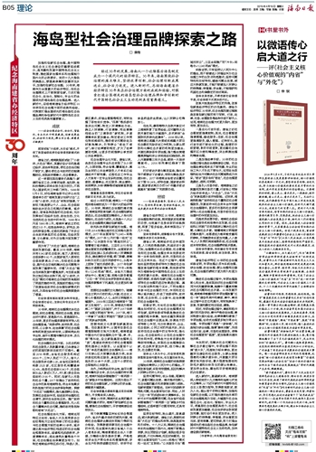 加强和创新社会治理,是中国特色社会主义社会建设的重要组成部分,是完善和发展中国特色社会主义制度、推进国家治理体系和治理能力现代化的必然要求。党的十九大报告明确提出,要提高保障和改善民生水平,加强和创新社会治理。30年来,海南作为全国最大的经济特区,在社会治理模式上不断探索创新,力求打造社会化、法治化、智能化、专业化的全国领先的海岛型社会治理品牌。进入新时代,总结海南建省办经济特区30年来在社会治理方面的成就和经验,对探索打造全国领先的海岛型社会治理品牌和争创新时代中国特色社会主义生动范例具有重要意义。