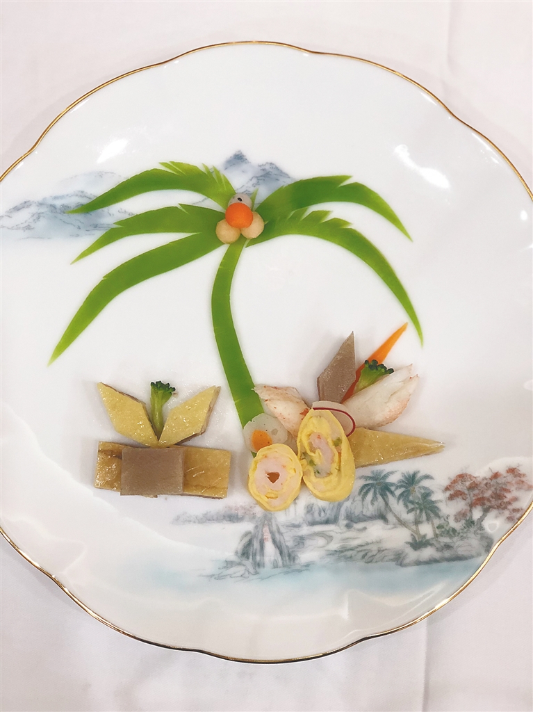 两个月前带领全省大厨圆满完成海南全球推介会冷餐会的琼菜特级大师李学深,又一次带领着来自三亚喜来登、海棠湾喜来登、三亚湾喜来登、神州半岛喜来登、海棠湾威斯汀和石梅湾艾美等省内六家高星级度假酒店的大厨们,在年会期间精心烹制以琼菜为主角的国宴。从选材到配料再到口味,李学深追求的是要保留琼菜的原汁美味;而从摆盘到创意,这些来自国际品牌酒店的大厨们则是结合琼菜特色展现出国际风范——青萝卜雕刻出来的惟妙惟肖的椰子树,将海南岛的椰风海韵带上了国宴;蓝色海沙、娇艳兰花以及各种热带水果装饰的桌面,将海南岛的热带风情尽情呈现出来……
