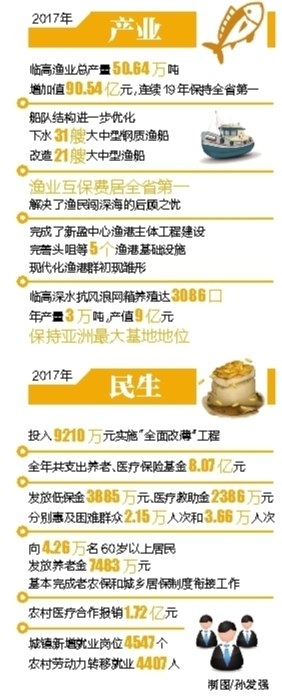 2017年,临高渔业总产量50.64万吨,增加值90.54亿元,连续19年保持全省第一。船队结构进一步优化,下水31艘大中型钢质渔船,改造21艘大中型渔船。渔业互保费居全省第一,解决了渔民闯深海的后顾之忧。也是在这一年,临高还完成了新盈中心渔港主体工程建设,完善头咀等5个渔港基础设施,现代化渔港群初现雏形。当前,临高深水抗风浪网箱养殖达3086口,年产量3万吨,产值9亿元,保持亚洲最大基地地位。