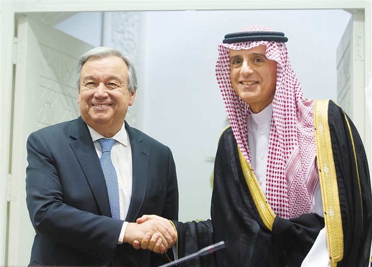 4月17日,在沙特阿拉伯利雅得,联合国秘书长古特雷斯(左)与沙特阿拉伯外交大臣朱拜尔在联合记者会后握手。