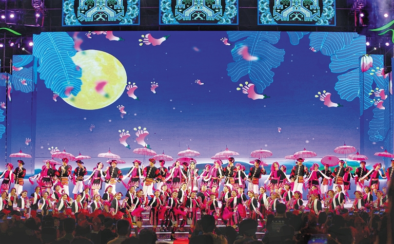 今天的文艺晚会分为“爱在三月间”“爱在天地间”“爱在五指山”等三个篇章,有民族特色歌舞、黎锦苗绣展示、沙画艺术、民歌联唱等近20个精彩节目。晚会节目充分展现了黎族苗族群众热爱生活,在党和政府带领下与各族同胞携手共创美好新海南、脱贫致富奔小康的热烈场景。台湾少数民族代表团登台表演了台湾特色民族节目。