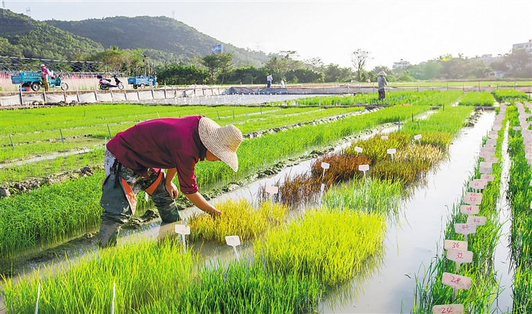 国家南繁科研育种基地内,清风吹拂,稻浪滚滚,百花飘香,稻穗籽粒膨大,随风低垂摇曳,田埂边、田地里,一群群农业科研人员戴着草帽,观察水稻的生长情况,详细记录下花、叶、茎等形态细节,得天独厚的光热条件,使得三亚具有发展南繁育种无可比拟的优势,热带特色高效农业加快发展;