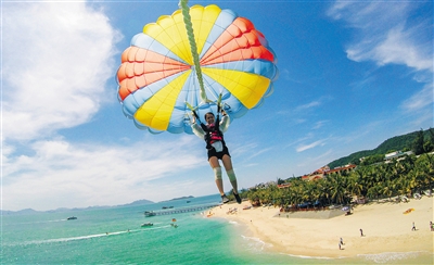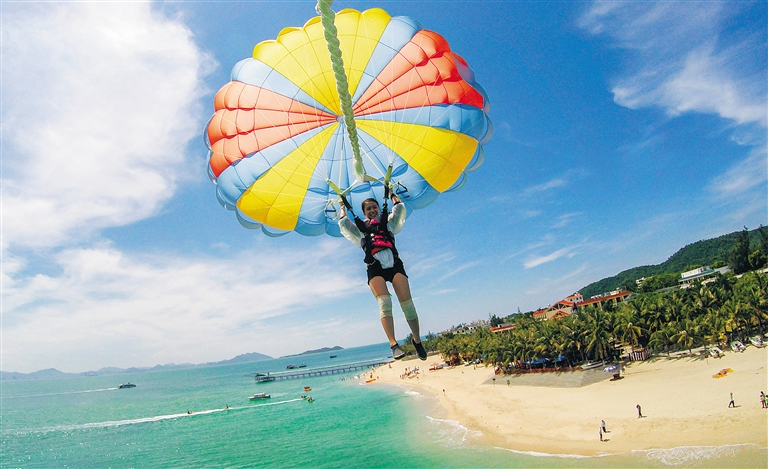 在三亚亚龙湾,一望无垠的海平面上,一圈圈水花有节奏地飞跃而起,香蕉船在海面上飞快穿梭,一家三口骑着水上自行车悠然自得,天际边一顶顶拖伞五彩斑斓,洁白细腻的沙滩上,一家老小尽享日光浴、逐浪戏水,一系列旅游新业态产品吸引着世界各地的游客汇聚于此、乐享时光;