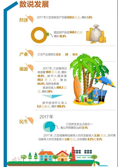 一张张优异的成绩单,是三亚以旅游业为龙头的现代服务业产业体系加快转型升级的一个缩影。三亚抢抓国家重要战略机遇,加快打造“大旅游”产业支柱,旅游产业转型升级加速明显,2017年,三亚接待过夜游客1831万人次,同比增长10.9%,其中入境游客69.3万人次,同比增长54.4%,创下历史新高;旅游总收入406.2亿元,同比增长26%,其中旅游外汇收入5.3亿美元,同比增长108.3%。