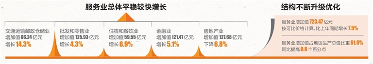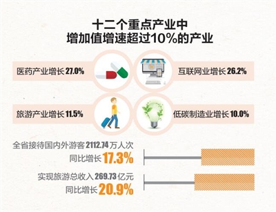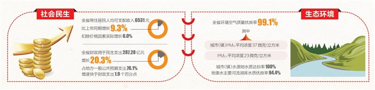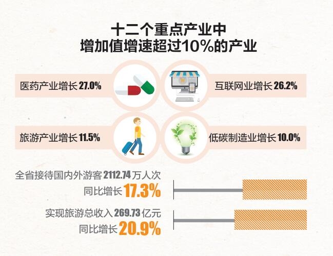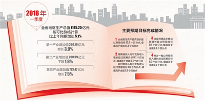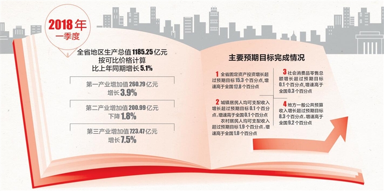 值得关注的是,一季度我省经济运行还呈现出几个特点与亮点:新动能进一步发力,新兴产业较快发展,全域旅游实现丁财两旺,六类产业园区、百镇千村建设稳步推进;结构不断升级优化,服务业占GDP比重进一步提高,房地产投资比重持续减少,消费升级类商品快速增长;质量效益持续提升,宏观效益保持良好态势,企业盈利能力、资金效率改善,去杠杆、降成本成效显现;生态环境保持优良水平,一季度全省环境空气质量优良率99.1%;社会民生稳步改善,城镇常住居民人均可支配收入8878元,名义增长8.1%,实际增长4.8%,农村常住居民人均可支配收入3758元,名义增长9.9%,实际增长7.1%。