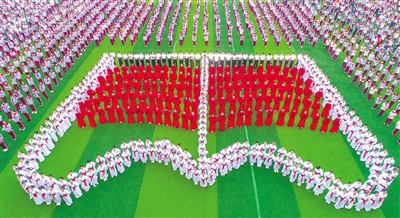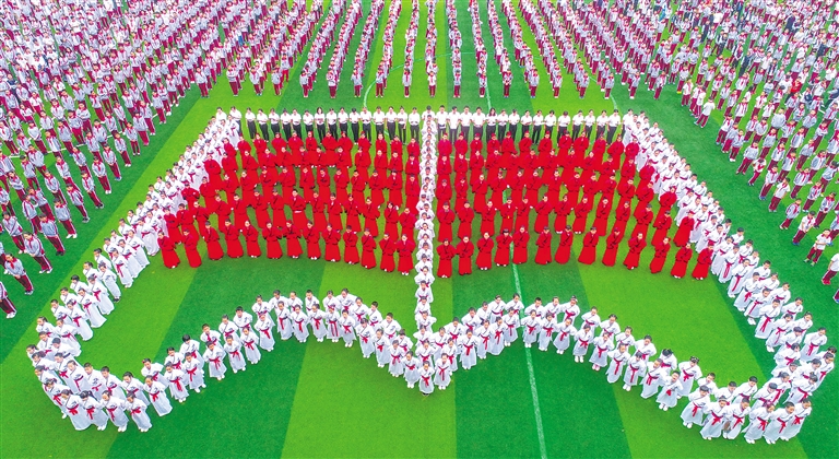 4月18日,随着世界读书日临近,在海口市龙华区玉沙实验学校操场,近400名身穿传统汉服的师生摆出巨型“书”造型,诵读经典古诗词。