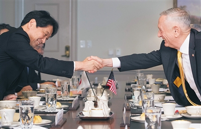 4月20日,在美国华盛顿,美国国防部长马蒂斯(右)与到访的日本防卫大臣小野寺五典握手。