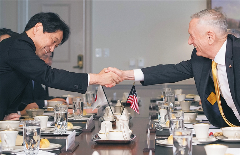 美国国防部长马蒂斯与到访的日本防卫大臣小野寺五典20日举行会谈。双方表示,美日将强化同盟关系,继续对朝鲜保持压力,直至其放弃大规模杀伤性武器和弹道导弹项目。
