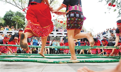 据悉,竹竿舞的跳法一直以来形式多样。最早是有两根竹竿,另有4根木棍架在上面,后来逐步发展出了“标准”架构,即两根粗竹竿,8根细竹竿;8人打竹竿,8人跳竹竿。“现在我们看到的是男女一起跳,但在以前,竹竿舞有着自己约定俗成的传统,即女孩子专司打竿,男孩子负责跳竿。”宋静敏说。