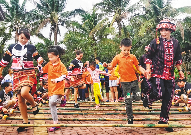 在舞蹈诗《黎族家园》中,主创人员还创新性地用竹竿拼凑出中国结等元素。除了在大舞台上作为艺术形式亮相,竹竿舞在日常生活中也得到了普及与推广。