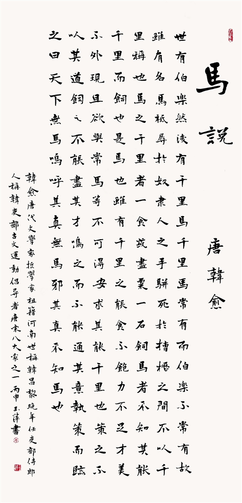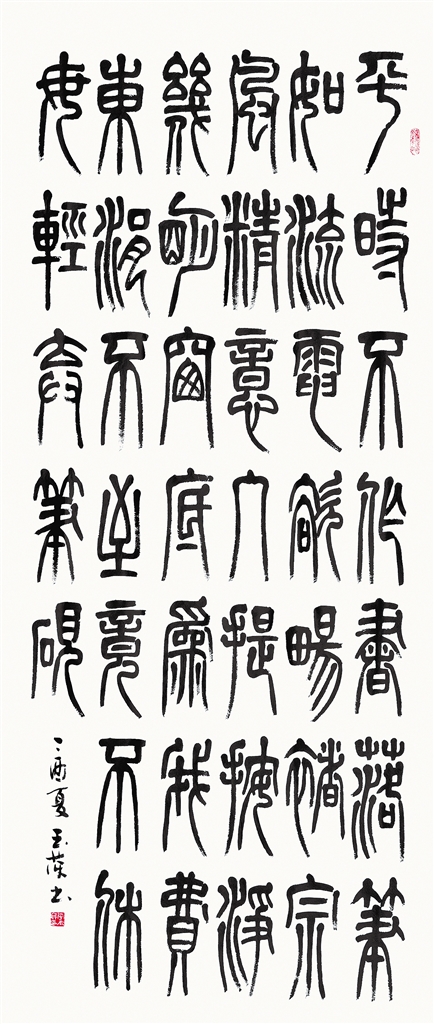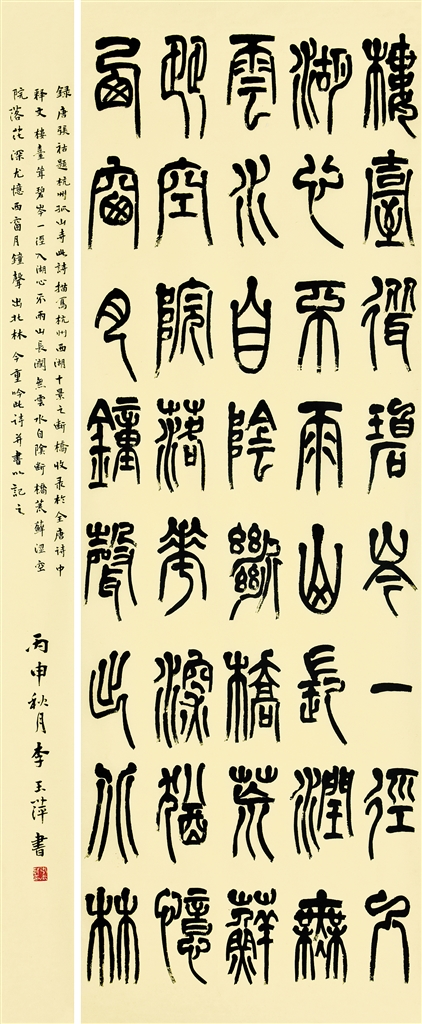 李玉萍自幼承家风,垂髫之年开始习书法。后进入南京艺术学院美术系学习,打下了坚实的基础。她的书法先从唐楷入手,后习魏碑、 “二王”、 米芾行书等等。在楷书和篆书上用功最勤,且以擅此著称。其楷书以临习北魏各碑为主,如《张黑女》等等。她写魏碑作品常常加入帖意,因行书运笔的融入,方圆转化自然,既显灵动活泼,又追求奇肆,沉稳碑味中透着浓浓的书卷气。尤显功底的是她的楷书作品大到单字的堂宇大作,小到千字的蝇头经文,皆能拿捏得当,把控自如,挥洒出尘,各显姿态,各具其妙。其篆书由《石鼓文》上溯金文,尤爱先秦篆。先秦人写字,线条外形看上去很简单,似没有许多的提按技巧和想法,其用笔也不复杂,粗、细较均等等。但表面的简单,而线条的表现却是超乎寻常的、令人难以企及的高度,一般人难以窥见其中奥妙。故赏篆者稀,习篆者寡,高手寥寥。她深得其妙,又融入小篆的笔意、结构,追古凝今,写出了自己的面目。她的隶书学汉碑之厚重,得浑厚之气象。行书以二王、米芾为主,悟结构平正寓奇之法、转换提按有自然之妙。对于中国画,她着重花鸟,小写意常常绘出自然大世界。