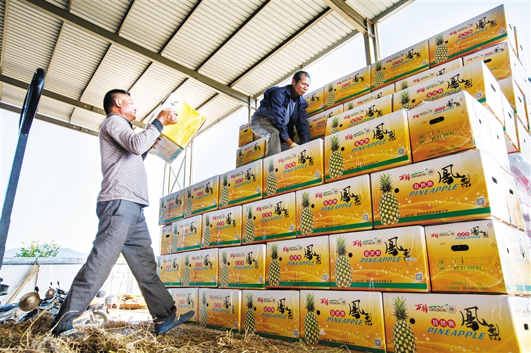 “目前是金菠萝上市季,平均每天金菠萝出岛售往北京、上海等内地市场约100吨。”万钟公司销售经理秦志君透露,该基地种植约8000亩金菠萝,此次采收的面积约3000亩,“因为金菠萝种植、结果的时间较长,我们采用分批采集的方式保障全年供应,第一批采收上市将持续至今年6月。”