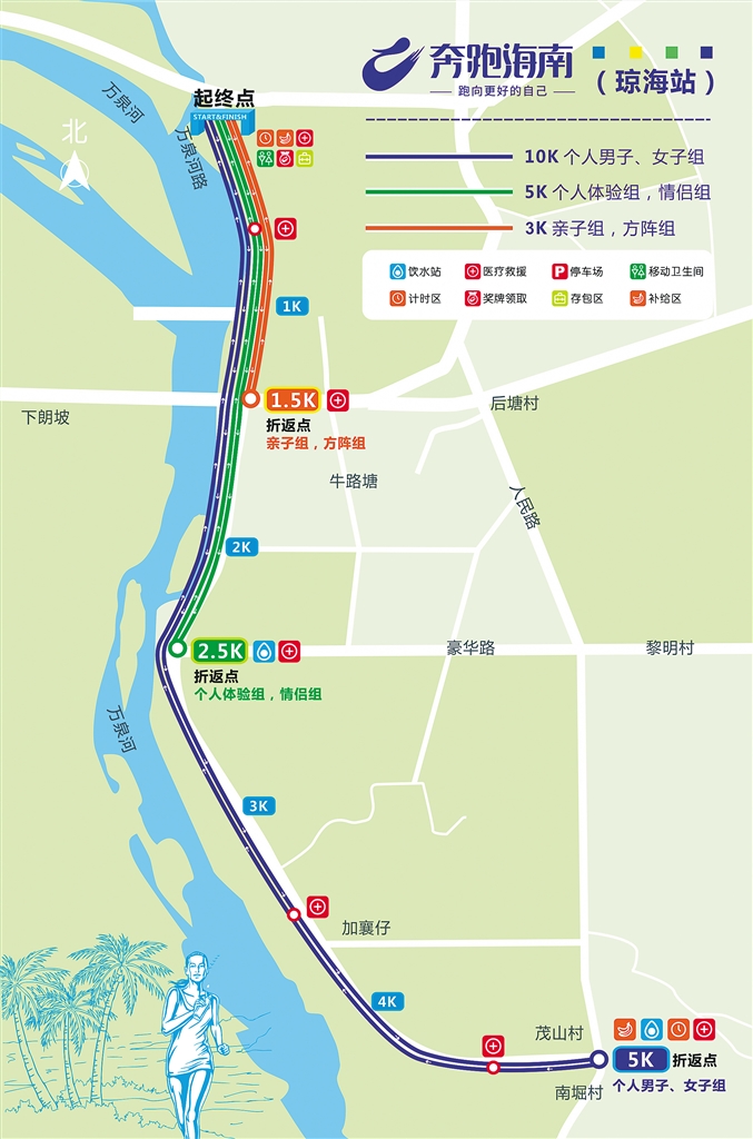 琼海,因充满传奇的红色娘子军、闻名世界的博鳌亚洲论坛、勤劳勇敢的潭门渔民,散发着独特的城市魅力。琼海很美,这里有美丽的万泉河,博鳌、潭门等风情小镇,还有龙寿洋万亩田野公园、北仍村,沙美村等乡村美景。美丽的琼海,是开展健跑等全民健身活动的绝佳场所。