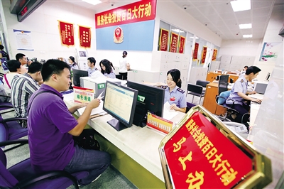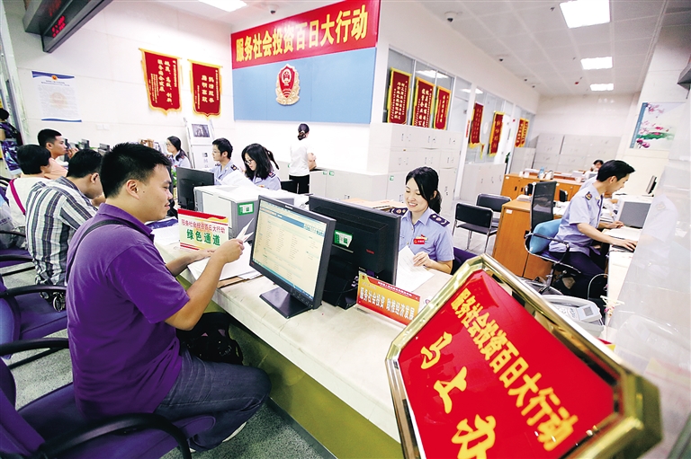 继2015年成功开展投资项目百日大会战之后,海南于2016年9月1日起到年底,在全省范围内开展服务社会投资百日大行动,通过促进社会投资增长、优化审批服务、提升金融服务水平、切实降低企业成本、建立保障机制等5个方面、25项具体工作措施,推动社会投资持续增长。图为海南省政务服务中心工商局“百日大行动马上办”窗口,工作人员为前来办理审批手续的人员提供便捷服务。