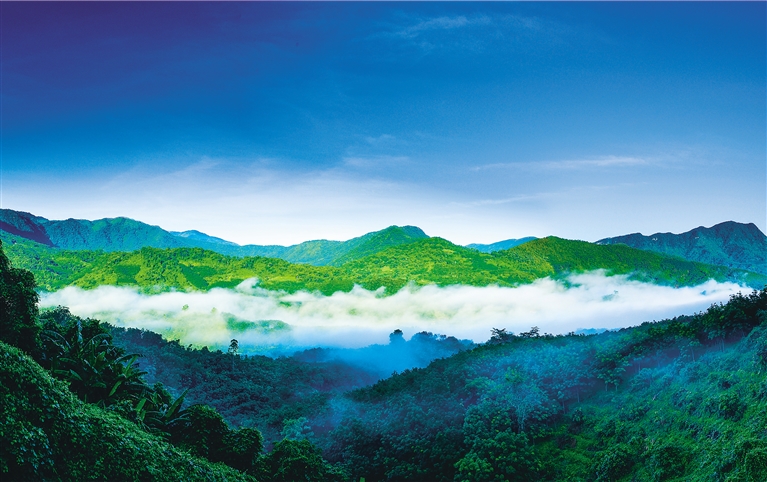 海南精心呵护青山绿水,让山更绿、水更清、天更蓝、空气更清新。图为风光奇绝的海南鹦哥岭自然保护区。