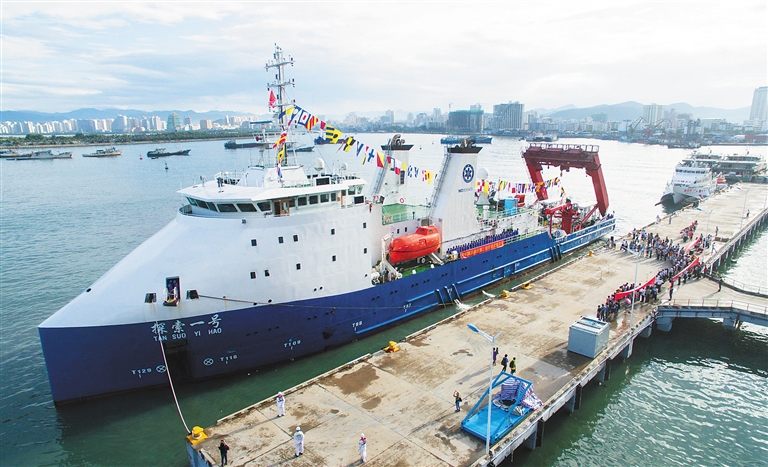 2016年8月12日,“探索一号”科考船首航太平洋马里亚纳海沟顺利归来,停靠三亚码头。