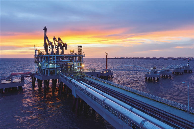 近年来,海南加快建设连接岛内各大城镇和主要景区的环岛天然气管网,基本形成全省天然气环岛主干网。图为海南液化天然气(LNG)项目停靠船舶的蝶形码头。
