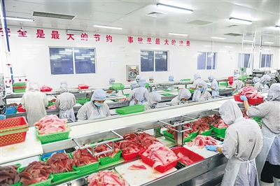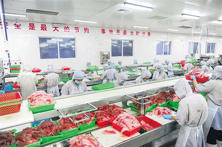 优质的海南罗非鱼已出口到了亚洲、美洲、非洲、欧洲多个国家和地区。图为位于澄迈的海南翔泰渔业有限公司罗非鱼生产线。