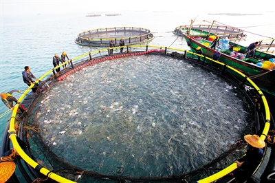 临高去年渔业总产量达50.64万吨,增加值90.54亿元,连续17年保持全省第一。图为临高一家深海养殖专业合作社的社员在深水抗风浪网箱养殖基地进行捕捞作业。