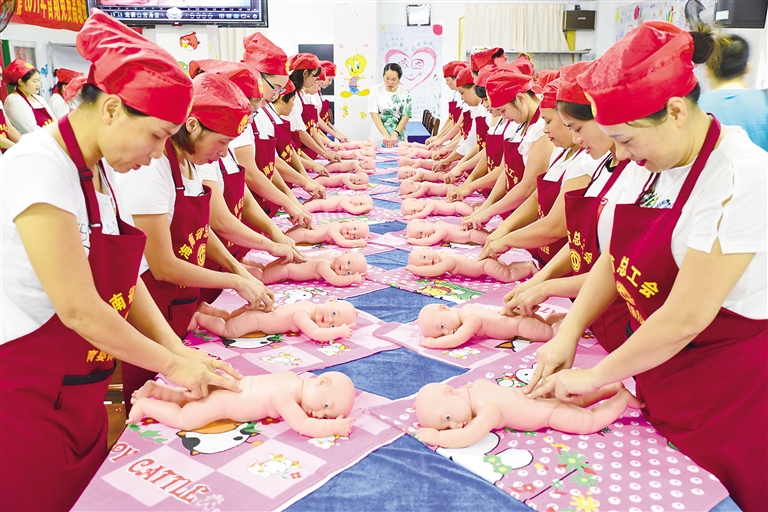 海南深入实施积极的就业政策,一方面,对困难群众及时开展有针对性的就业培训,提升其就业能力;另一方面,不断拓宽就业空间,鼓励大众创业、万众创新,将百姓就业与全域旅游、产业培训、脱贫攻坚、美丽乡村建设等紧密结合,让群众在家门口就能就业。图为海南省总工会职工培训中心免费培训农民工育婴知识。