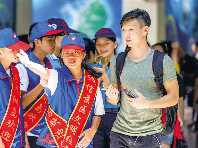 为推动全省精神文明建设迈上新台阶,我省深入开展社会文明大行动,创建海南文明岛,明确了“一项引领工程、五大文明创建活动、九个专项行动”的重点内容,为加快建设美好新海南提供强大的思想保证、精神力量和道德滋养。图为陵水黎族自治县分界洲岛旅游区,志愿者为游客提供咨询及引导服务。