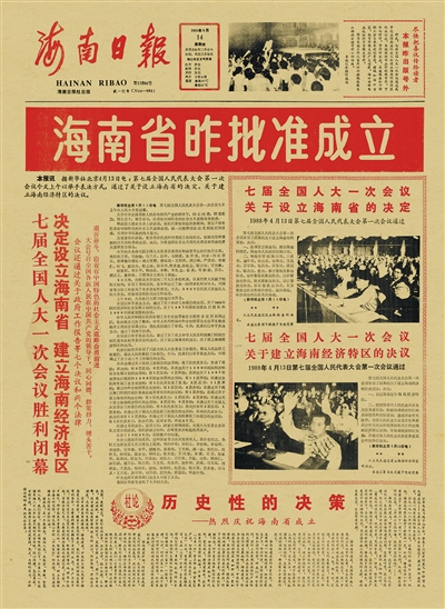 图为4月14日《海南日报》刊登的海南建省消息。
