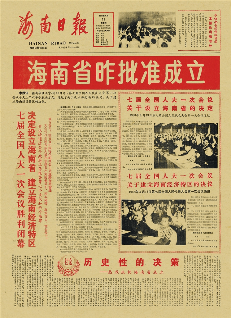 4月13日,七届全国人大一次会议通过《关于设立海南省的决定》和《关于建立海南经济特区的决议》,把海南从一个贫穷落后的边陲地区推到了中国改革开放的最前沿。从此,海南成为我国最年轻的省份和最大的经济特区,海南的发展进入了一个崭新的历史时期。