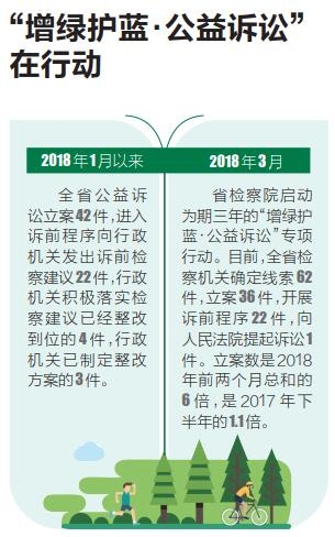 此外,今年3月,省检察院还决定在全省启动为期三年的“增绿护蓝·公益诉讼”专项行动。自专项行动以来截至今天,全省检察机关确定线索62件,立案36件,开展诉前程序22件,向人民法院提起诉讼1件。立案是2018年前两个月总和的6倍,是2017年下半年的1.1倍。