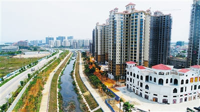 4月26日,在八所城区碧海云天小区附近的竹金沟,记者看到,污水经过一体化处理设备应急处理后才排放,河道水面干净,水中可见城市建筑和树木的倒影。记者在解放中路段的中心排水沟看见,河道内没有垃圾及漂浮物。