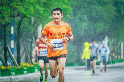 一场大雨不期而至,雨点不停打在参赛者黄青叶的脸颊上,但他丝毫没有受到天气的影响,惬意享受着在雨中奔跑的快乐。
