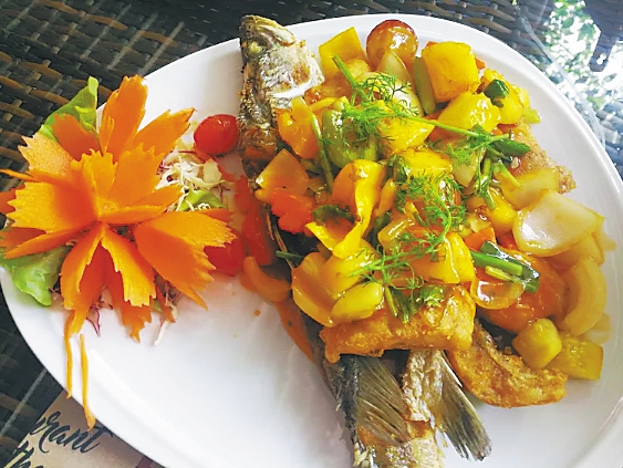 精美的泰式甜酸鱼,爽口的青菜粉丝肉丸汤,价格都很实惠。芒果咖喱软脚蟹,是我认为最美味的菜,超级好吃,我们连螃蟹腿都啃光了,一点不剩。