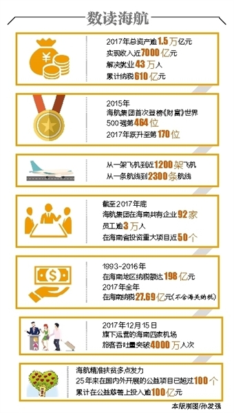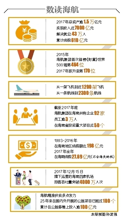如今,海航已经从南海明珠的一家地方航空运输企业发展成为大型跨国企业集团,2017年总资产逾1.5万亿元,实现收入近7000亿元,累计纳税610亿元。2015年,首次登榜《财富》世界500强第464位,2017年跃升至第170位。
