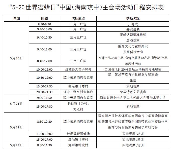 本届“5·20世界蜜蜂日”中国(海南琼中)主会场活动由亚洲蜂业联合会、中国养蜂学会、国家蜂产业技术体系共同主办,琼中黎族苗族自治县人民政府、海南省蜂业学会、中国热带农业科学院环境与植物保护研究所共同承办的一次世界性的蜜蜂主题活动,活动还设立了78个分会场,全国各蜜蜂博物馆、蜜蜂文化园同时响应并开展活动。