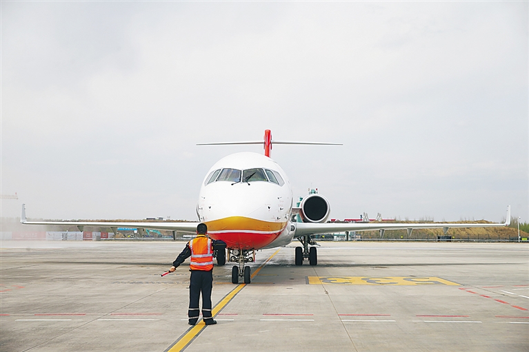 5月2日,ARJ21-700新支线喷气客机驶进哈尔滨太平国际机场停机坪。当日,首次执飞成都航空公司EU2239航班的ARJ21飞机,从成都起飞、经停济南后准时抵达哈尔滨太平国际机场,完成3200公里的干线飞行;经过短暂的休息,飞机再次腾空而起,踏上了从哈尔滨往返黑河的支线飞行旅程,完成了5个飞行小时的“干支结合”飞行任务。 新华社记者 丁汀 摄