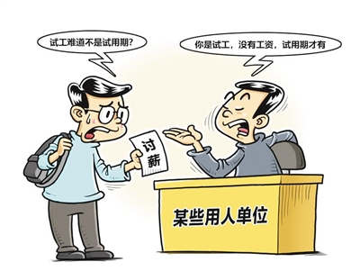 ——巧创新词,“试工”等于“试用”?“一些案例中,用人单位巧创新词,以‘试工’代替试用期,规避法律规定。”一些用人单位以“试工”名义拖欠员工薪资。“法律上并没有‘试工’这一概念。审理时,我们一般认定‘试工’即为一般意义上的试用。用人单位对不符合录用条件的劳动者,可以依法解除劳动关系,但应当支付劳动者已付出劳动的报酬。”