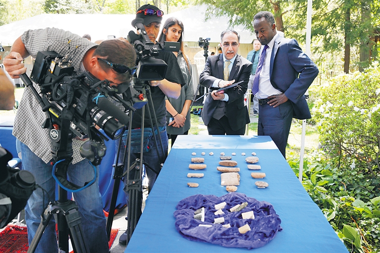 5月2日,在美国首都华盛顿特区伊拉克驻美大使官邸外,记者拍摄美国向伊拉克政府归还的部分走私文物。