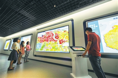 在海南省规划展览馆,市民可以通过多规合一综合信息管理平台查询海南省总体规划的有关信息。图为5月2日,前来参观的市民通过操作一旁的电脑,在大屏幕上观看海南省土地利用规划图。本报记者 袁琛 摄