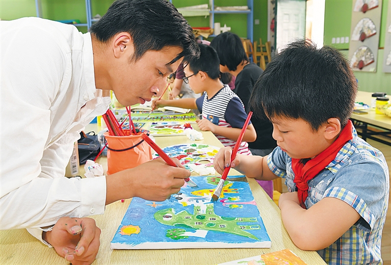 5月3日,为迎接“五四”青年节,四川美术学院5名研究生来到四川省绵阳市北川县安昌小学,与这里的小朋友一起作画,描绘北川的未来及孩子们的梦想。新华社记者 刘坤 摄
