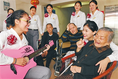 5月3日,中国铁路南昌局集团有限公司福州客运段组织团员青年,利用工休时间来到福州红星老人公寓,以志愿服务的方式迎接“五四”青年节的到来。新华社记者 张国俊 摄