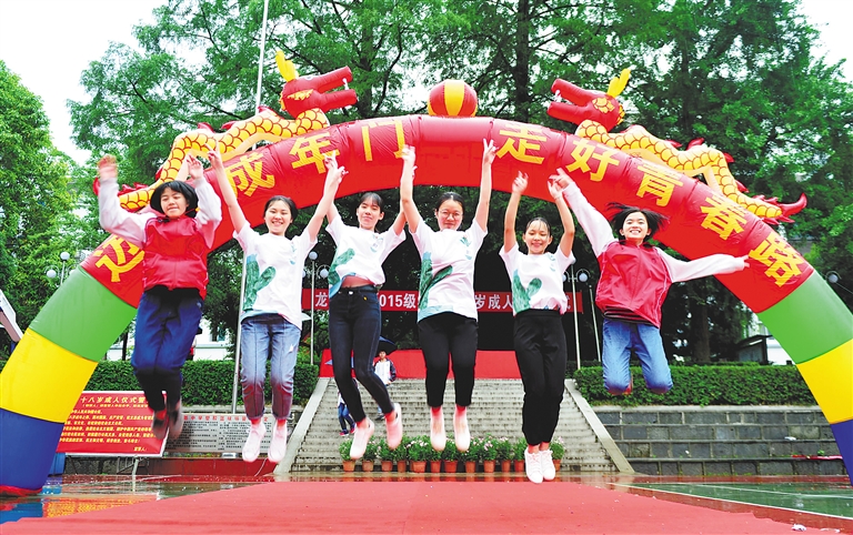 5月4日,在广西龙胜各族自治县龙胜中学,学生在“成年门”前欢呼跳跃。
