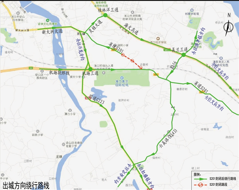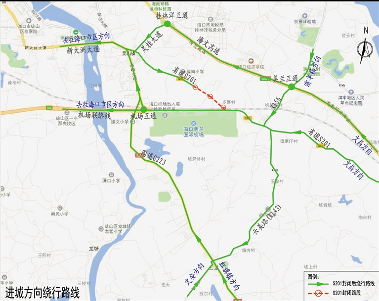 (四)文昌经S201往海口绕城高速方向的车辆建议绕行机场进场路临时便道或云美公路-G223国道。