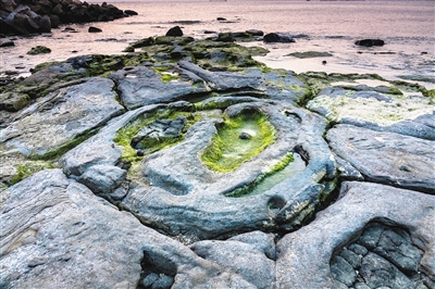 玄武岩海蚀平台上千奇百怪,有穴、有沟、有槽,如足、如盆、如琴、如书、如网格、如象形文等等。最具特色的,非龟背石莫属。当地人称神龟石。