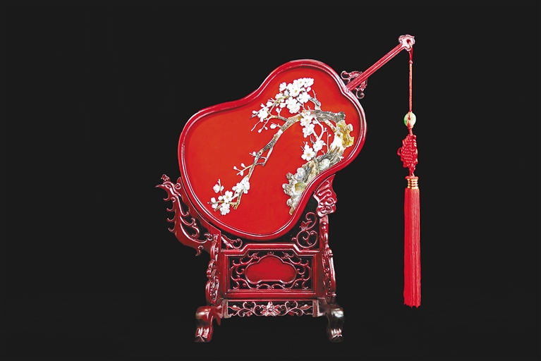 除了梅花主题的贝雕画仍以挂画的形式呈现,以“丹凤朝阳”“金玉满枝”为主题的贝雕画在呈现形式上也别出心裁,将贝雕画装裱在宫廷扇摆件上,色泽鲜明的贝壳与厚重古朴的木制宫廷扇摆件合二为一,两种极具中国风的造型相得益彰。