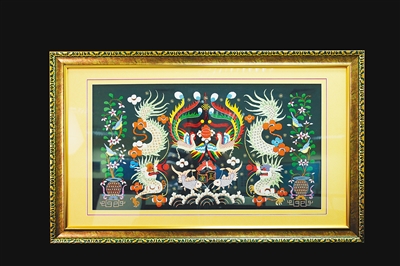 每一份国礼,都蕴含着美好的祝愿。于是,这三件黎锦的图案设计中不仅有龙凤、鲤鱼等中国传统吉祥元素外,《黎家乐》更是把“新时代,幸福要靠奋斗来”的寓意织就出来,此外更有黎族同胞丰收图、舂米纺织生活图,不仅展现了黎锦纺、染、织、绣工艺,亦把海南黎族的特色民俗风情展现得淋漓尽致。
