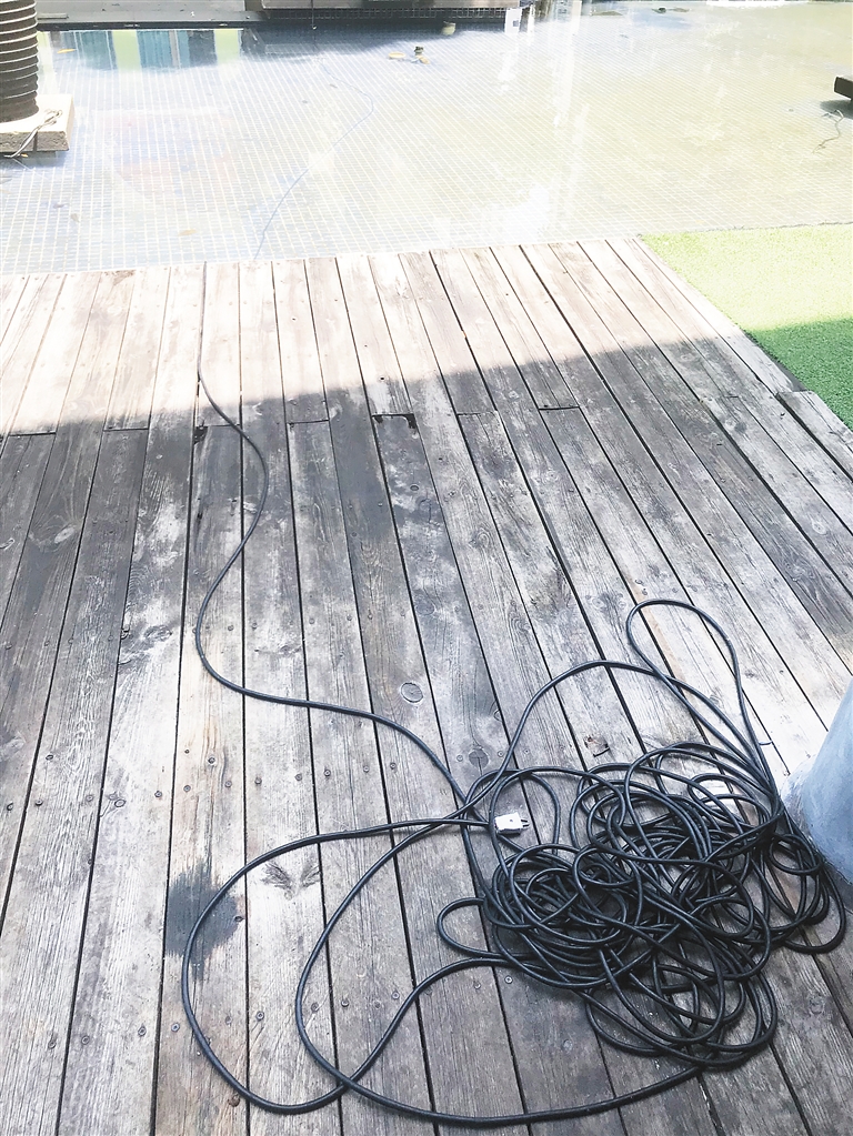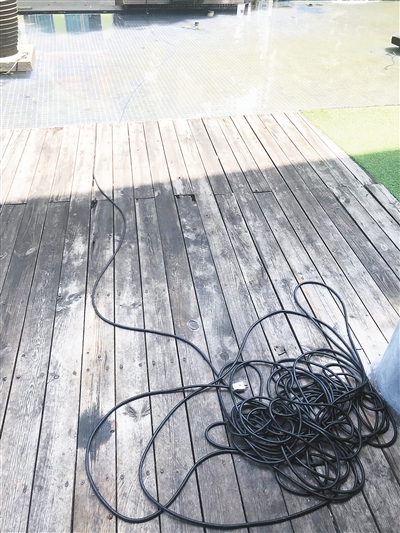 该健身馆的工作人员介绍,这条电线是6日上午馆内销售部门工作人员放置的,主要是用于清洗水池时供电给抽水泵,以便抽完水后对水池进行清洗,这也是他们每月都要进行2次至3次清洗水池的工作要求,且只有在要用的情况下才插电使用,期间现场会有多名工作人员操作,以确保过往行人安全。但是,由于6日当天遇到暴雨天气,没有办法及时开展清洗水池工作,当时的工作人员没有注意收回电线,这才有了黄先生反映的情况和记者赶到现场时看到的一幕。