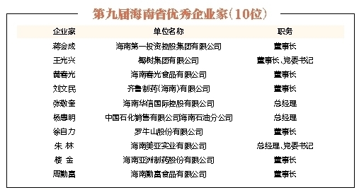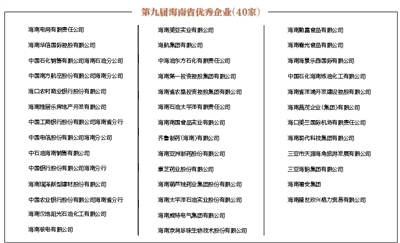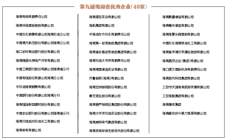 为贯彻落实党的十九大精神,全面落实《中共中央国务院关于营造企业家健康成长环境弘扬优秀企业家精神更好发挥企业家作用的意见》,大力弘扬企业家的实干精神,充分发挥企业家示范作用,造就优秀企业家队伍,表彰做出突出贡献的海南省优秀企业、优秀企业家,海南省企业联合会、海南省企业家协会、海南省总工会于2018年1-4月,在全省组织开展第九届海南省优秀企业、优秀企业家评选与表彰活动。在企业自愿申报的基础上,通过由省相关厅(局)组成的评审委员会,严格按照评审标准、程序,本着优中选优、公平、公正、公开的原则,评选出优秀企业40家、优秀企业家10名。现将评审结果公示如下,公示日期自2018年5月8日至12日,公示期间如有异议,请及时向评审办公室反映。 电话:(0898)66569335 传真:(0898)66569396 海南省总工会 海南省企业联合会 海南省企业家协会 二〇一八年五月八日