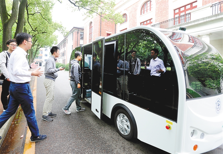 5月开始,由上海交通大学电子信息与电气工程学院与青飞智能联合研制的无人驾驶小巴在校园内进行实验性运行。在校园内设置的3个站点,乘车者可以扫描二维码呼叫无人小巴接载,车上的自动驾驶系统采用感知地图匹配的方法,通过激光点云对无人车进行定位和导航,不仅能自主驾驶,还能自动躲避行人。在目前实验性运行阶段,该小巴时速限定15公里,车内最多搭载8人,每日载客总数约200人次。车上配备安全员跟车,以保证安全。 新华社记者 刘颖 摄