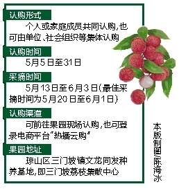 琼山区有关负责人透露,根据活动规则,仅需支付520元,就可认购一棵荔枝树,并获得主办单位授予的认购证书。认购者可获得该荔枝树当年的“挂名权”、进园采摘荔枝资格、可采摘当季荔枝果至少60斤。此外,520元认购金中的20元将转入琼山区扶贫办专项扶贫账户,专门用于实施精准扶贫,助力果农增收致富。