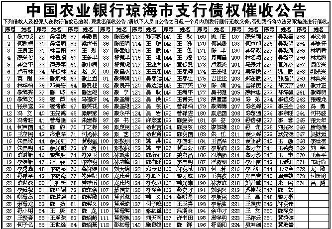 下列借款人及担保人在我行借款已逾期,现发出催收公告,请以下人员自公告之日起一个月内到我行履行还款义务,否则我行将依法采取措施进行催收。