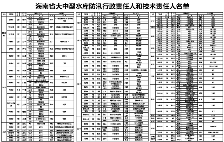 海南省大中型水库防汛行政责任人和技术责任人名单